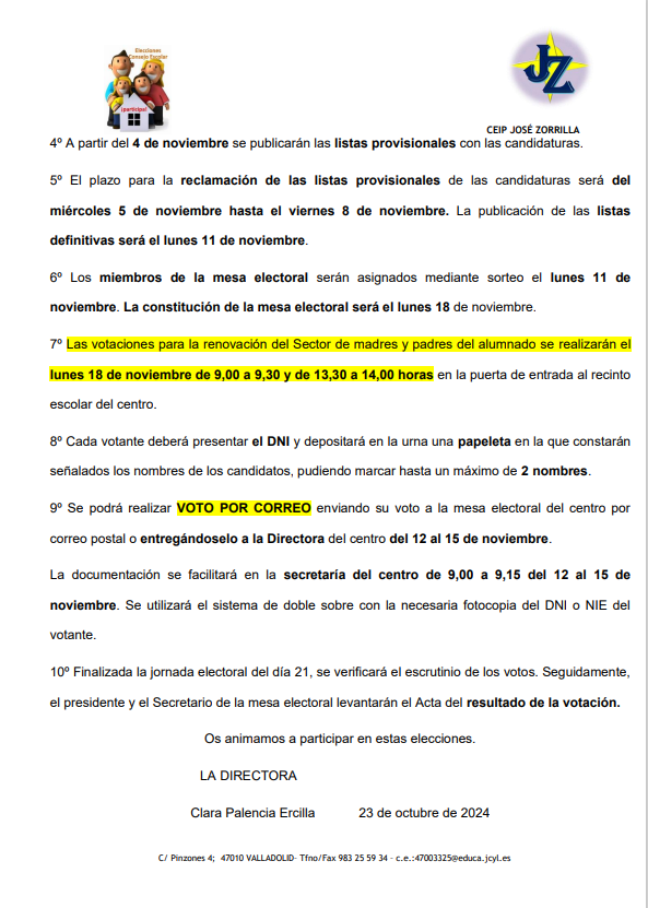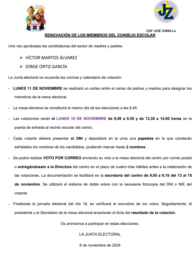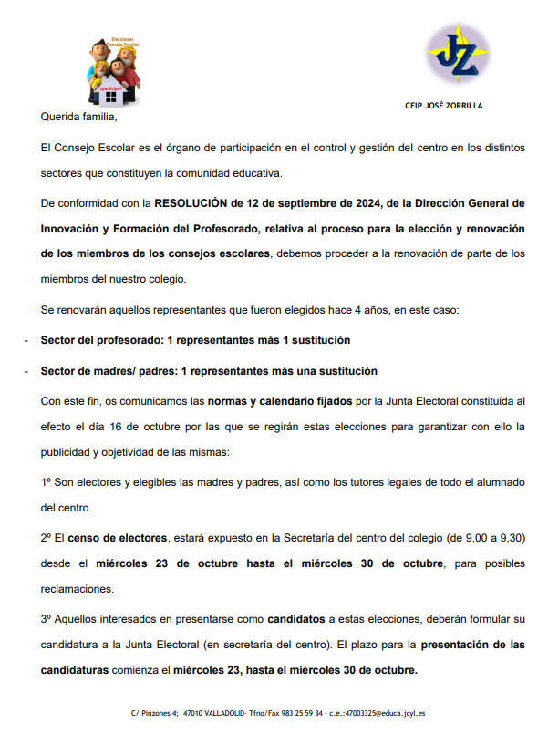 De conformidad con la RESOLUCIÓN de 12 de septiembre de 2024, de la Dirección General de Innovación y Formación del Profesorado, relativa al proceso para la elección y renovación de los miembros de los consejos escolares, debemos proceder a la renovación de parcial del Consejo Escolar de nuestro Colegio.